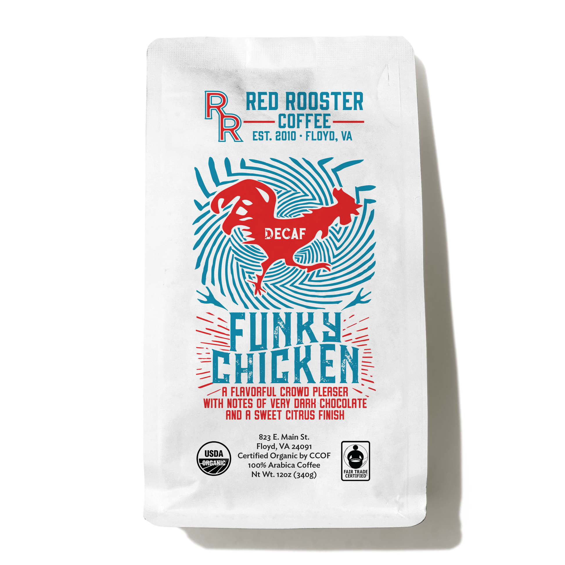 One of our most popular blends is also available in decaf! Just like the caffeinated Funky Chicken, this coffee is an earthy, chocolatey crowd pleaser with notes of praline, dark chocolate and citrus with light acidity and caramel sweetness.