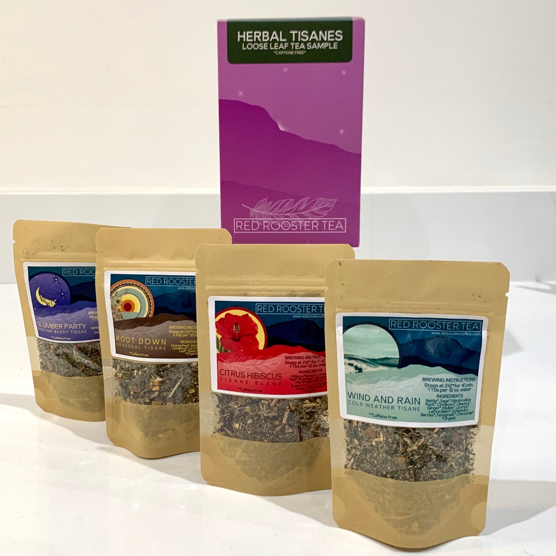 Sample four unique herbal tisanes, each designed to delight your senses! Our Herbal Tisanes Sample Box contains Slumber Party (lavender, chamomile, rose petals, and mint), Wind and Rain (leaves, flowers, and dried fruits), Citrus Hibiscus (citrus, hibiscus, and rosehips), and Root Down (roots, flowers, and herbs). Each resealable bag includes a list of ingredients and brewing instructions on the label. What’s your favorite?